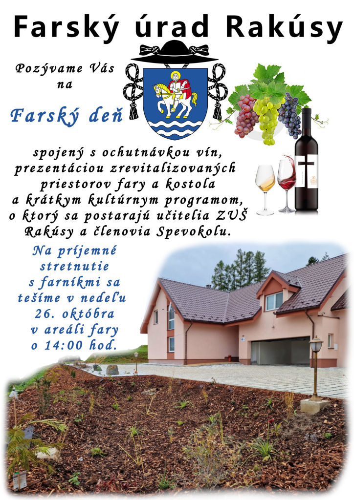 Pozývame farníkov farnosti Rakúsy na Farský deň v areáli Rímskokatolíckeho kostola sv. Martina v Rakúsoch, ktorý sa bude konať v nedeľu, 26. októbra 2025 od 14:00 hod.