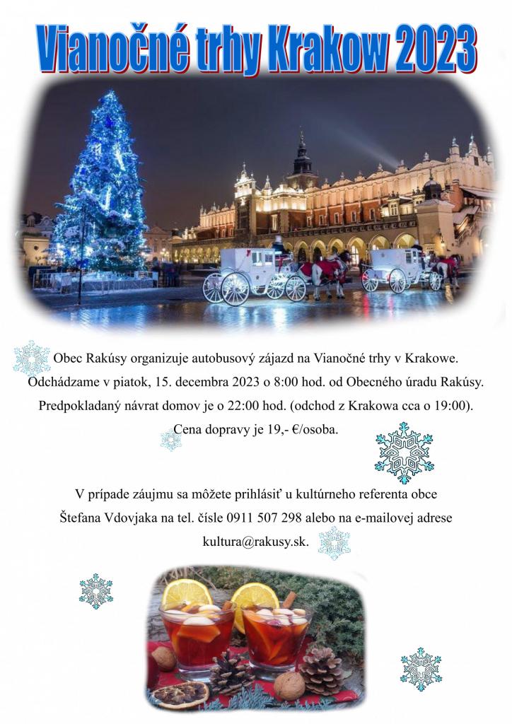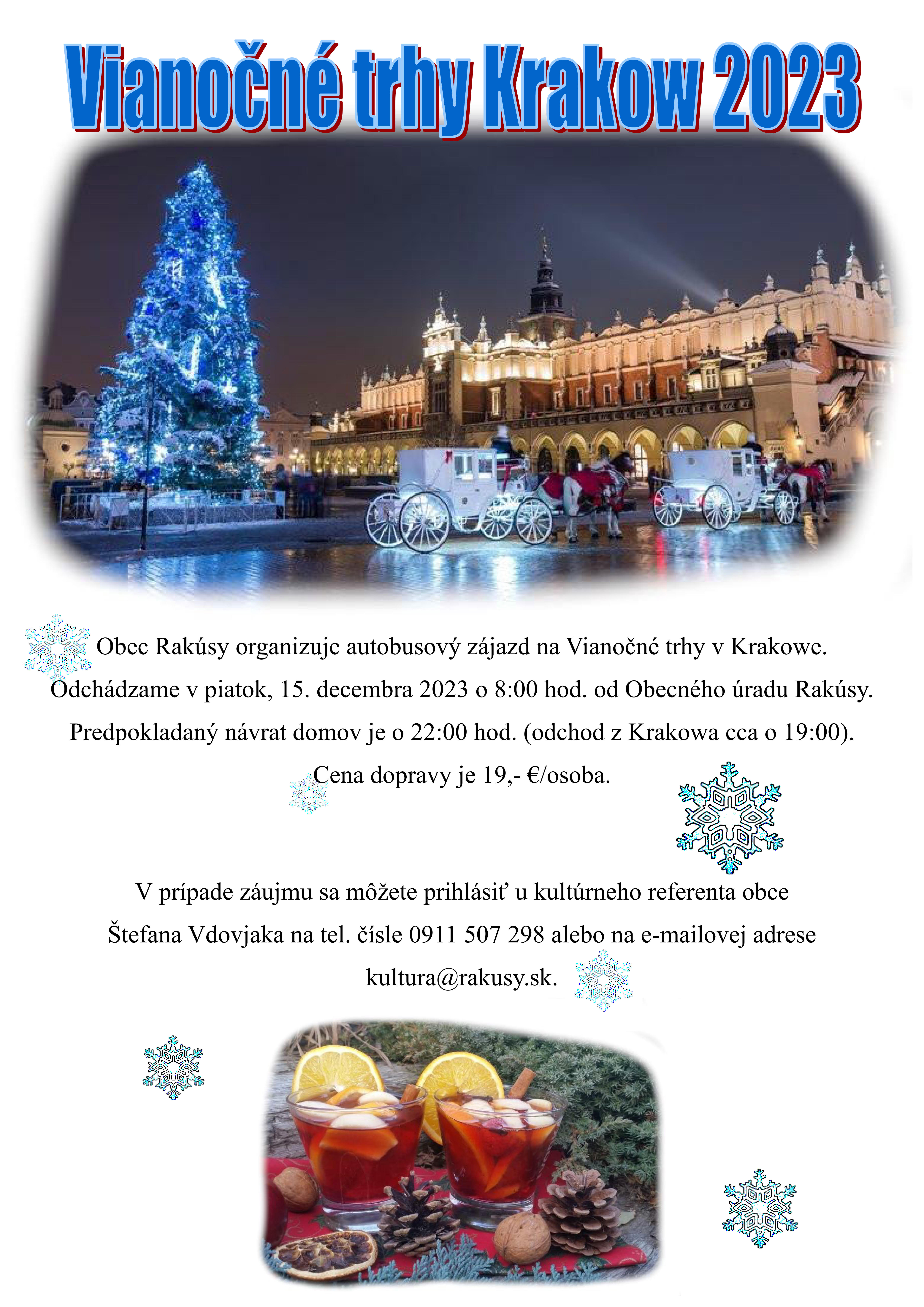 Zájazd dňa 15.12.2023 V prípade záujmu sa môžete prihlásiť u kultúrneho referenta obce Štefana Vdovjaka na tel. čísle 0911 507 298 alebo na e-mailovej adrese kultura@rakusy.sk.