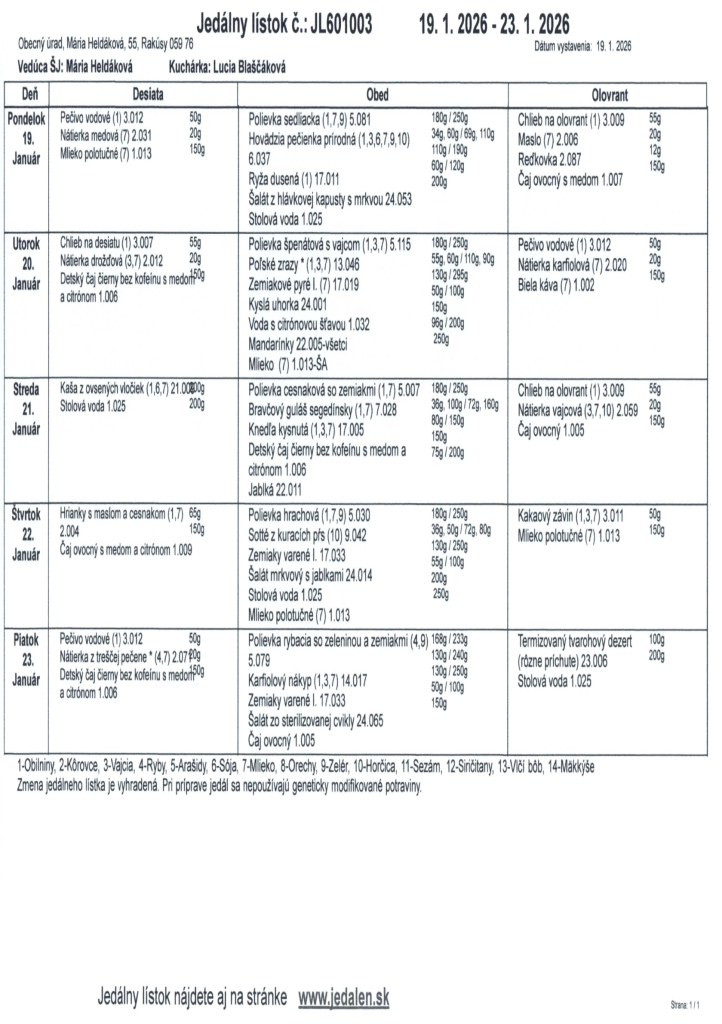 Jedálny lístok platný od 19.01.2026 - 24.01.2026